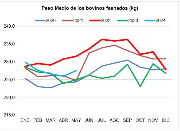 El peso promedio de las carcasas bovinas correspondiente al quinto mes del corriente año alcanzó los 227,5 kilogramos, siendo un (+0,7%) superior a los 225,9 kilogramos del último mes de abril; y resultando levemente superior, (+1,1%), a los 224,9 kilos de mayo de 2023. El peso medio de las carcasas durante los cinco meses que han transcurrido del corriente año se ubicó en 227,5 kilogramos; un (+0,6%) por encima de los 226,2 kilogramos del mismo periodo del año anterior.