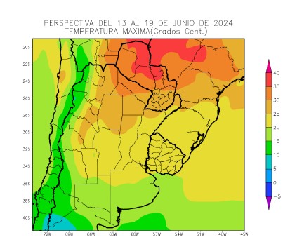 Al inicio de la primera etapa de la perspectiva soplarán los vientos del trópico, llegando con fuerza al norte y el centro del área agrícola, donde producirán máximas sobre lo normal, pero sin lograr llegar al sur, que comenzará a experimentar la llegada de los vientos polares, que acompañarán a un frente de tormenta que inicia su paso. El este del NOA, gran parte de la Región del Chaco, el norte de Misiones, el noroeste de Corrientes, el sudeste del Paraguay y el noroeste de Santa Fe observarán temperaturas máximas superiores a 25°C, con focos con valores superiores a entre 30 y 35°C, hacia el norte. El centro del NOA, el este de Cuyo, la mayor parte de la Mesopotamia, el norte de la Región Pampeana y el Uruguay observarán temperaturas máximas entre 20 y 25°C, con focos con valores superiores. El centro-oeste del NOA; el centro-oeste de Cuyo y gran parte de la Región Pampeana observarán temperaturas máximas entre 15 y 20°C. El oeste del NOA y el oeste de Cuyo observarán temperaturas máximas inferiores a 15°C.