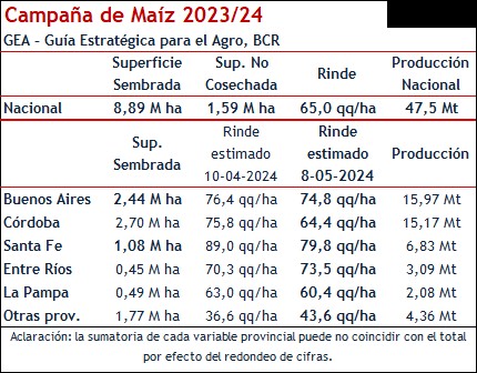 Con un 50% de avance de la trilla Argentina, se esperan que los granos de los maíces tardíos bajen su contenido de humedad para seguir la cosecha, aunque se empieza a adelantar la cosecha por la vulnerabilidad de los tallos tras el ataque de chicharrita en el centro y norte del país. Lamentablemente, se observa que los datos de en los lotes en los que se está avanzando con la cosecha no son optimista y pueden ser el presagio de un nuevo ajuste negativo para el cereal argentino por los efectos del spiroplasma. Por ahora se mantienen los guarismos de mayo con una siembra récord de 8,89 M ha y 1,42 M ha que no entrarían al circuito comercial. Con una producción total estimada de 47,5 Mt (el aumento respecto al malogrado ciclo anterior es de un 32%).