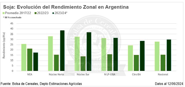 Por su parte, luego de un progreso intersemanal de 3,8 p.p. la cosecha de soja a nivel nacional transita su recta final habiéndose recolectado el 96 % de la superficie apta. Las labores se concentran principalmente sobre el norte del área agrícola y el Centro-Este de Entre Ríos. Por otro lado, la cosecha de soja de segunda, próxima a finalizar, ha obtenido rendimientos por encima del promedio histórico, principalmente sobre ambos núcleos, Norte de La Pampa - Oeste de Buenos Aires y Sur de Córdoba. Las precipitaciones ocurridas a partir de la segunda quincena de febrero han sido oportunas para las siembras tardías, permitiendo impactar sobre los componentes del rendimiento. Esta situación amortiguó la caída de los rindes por debajo del promedio sobre el NEA. Bajo este contexto mantenemos nuestra proyección de producción en 50,5 MTn.