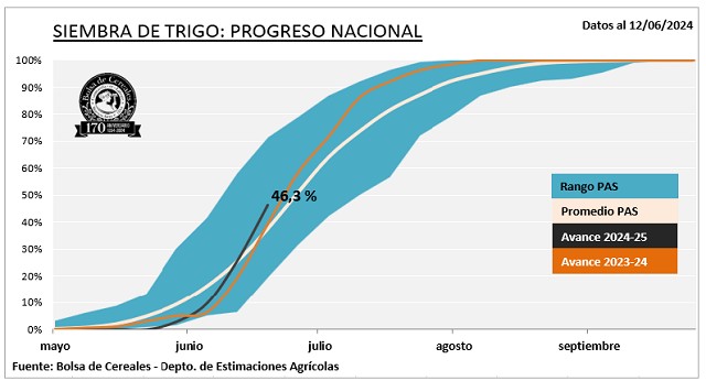 Luego de un progreso intersemanal de 20,6 puntos porcentuales, la siembra de trigo ya cubre el 46,3 % de las 6,2 MHa proyectadas. Se registra un adelanto interanual de 7,3 p.p.