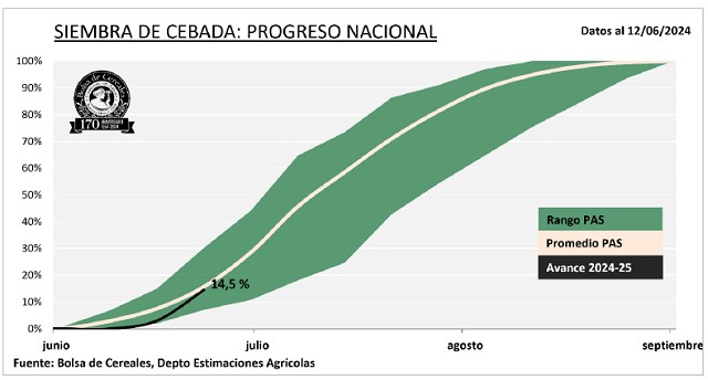 Asimismo, la siembra de cebada, luego de un avance interquincenal de 11,1 p.p., ya cubre el 14,5 % de la superficie proyectada. Las labores se concentran principalmente sobre la región central, mientras que sobre los núcleos cebaderos del sur las últimas precipitaciones han mejorado la humedad superficial que permitirán retomar las labores.