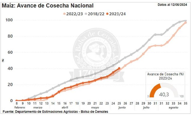 Con un avance del 40,3 % en la cosecha, los rindes alcanzan los 75,3 qq/Ha. El rinde promedio de planteos tardíos desciende a 53,5 qq/Ha. Mantenemos nuestra proyección de producción en 46,5 MTn.