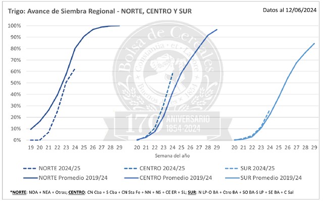 En las zonas del centro y sudoeste del área agrícola, la siembra registró progresos regionales de más de 22 p.p. en comparación a la semana previa, respondiendo a la necesidad de cubrir la mayor superficie posible aprovechando la humedad disponible, a la espera de nuevas lluvias que podrían incrementar el área destinada al cereal. En simultáneo, sobre el Sudeste de Buenos Aires, la intención de siembra se renovó luego de las lluvias, pero el ritmo de avance se desaceleró. No obstante, sobre el norte del país, la falta de humedad superficial ralentiza la entrada de las máquinas, lo que podría comprometer el cumplimiento de los planes de siembra.