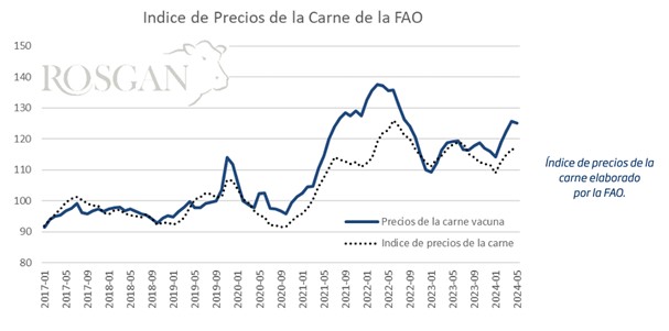 De acuerdo al seguimiento de precios de la FAO, en mayo el índice general registró un promedio de 116,6 puntos, apenas 0,2% menos que en abril, situándose un 1,3% por debajo de su valor de hace un año mientras que, el precio de la carne vacuna, a pesar de haber registrado en mayo una ligera baja mensual, permanece 5 puntos por arriba del nivel del año pasado.