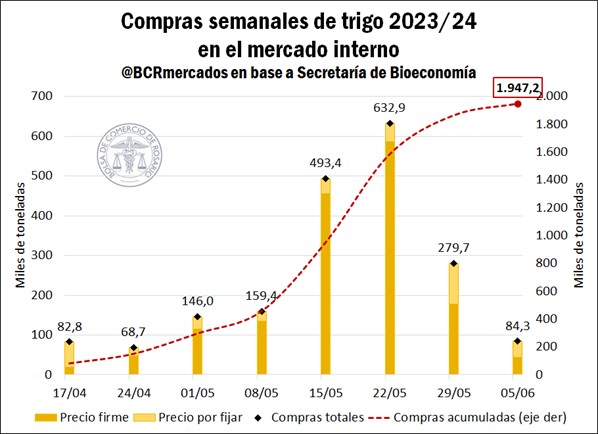 No obstante, en lo que respecta a la comercialización de la nueva campaña, se advierte que el retroceso en los precios a cosecha observado durante las últimas semanas puso un freno a las compras anticipadas del cereal. Los datos de la Secretaría de Bioeconomía indican que en la semana finalizada el 5 de junio, las compras de trigo de la campaña 2024/25 por parte de la industria y de la exportación ascendieron a apenas 84.300 toneladas, mientras que durante las cinco semanas previas el volumen de comercialización promedio había alcanzado 342.300 toneladas. Asimismo, sólo el 51% de las 84.300 toneladas comercializadas se realizaron con precio en firme, siendo que en las semanas anteriores este porcentaje ascendía, en promedio, al 82%.