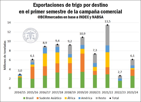 En segundo lugar, sobresalen los envíos con destino al Sudeste Asiático, los cuales durante el mismo período de la campaña previa habían resultado nulos. Así, durante el primer semestre de la campaña 2023/24, se registraron embarques por 1,3 Mt hacia dicha región de oriente. También retornaron los embarques de trigo con destino a África, que ascendieron a más de 303.000 toneladas entre diciembre y mayo, en tanto los envíos hacia América, sin contar Brasil, ascendieron un 25%, totalizando casi 606.000 toneladas del cereal.