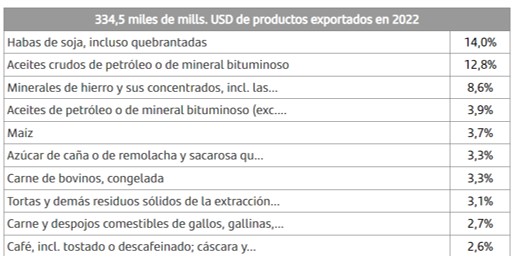 Sobre el total de las exportaciones, la soja cubre el primer puesto, fundamentalmente dirigidas a China. El cuadro lo muestra: