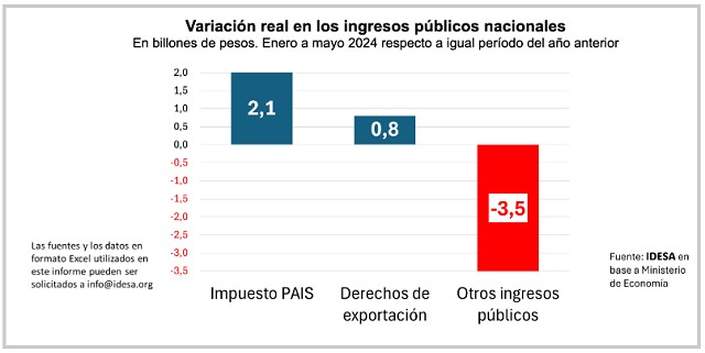 La inédita reducción del gasto y la relativa estabilidad de los ingresos lleva a no prestarle suficiente atención al comportamiento de los impuestos. En este sentido, según datos del Ministerio de Economía, entre enero a mayo del 2023 y el mismo período del 2024, se observa que: