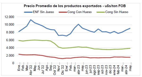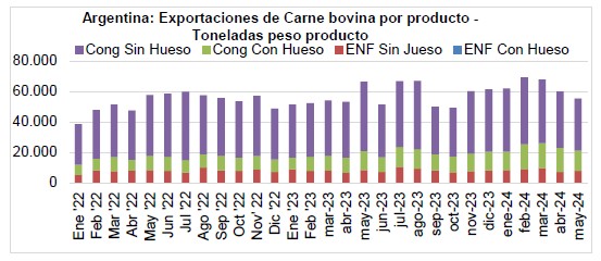 En mayo de 2024, se exportaron 34,1 mil toneladas de carne bovina congelada sin hueso, por un valor de 131,1 millones de dólares. El precio promedio de las exportaciones de carne bovina congelada sin hueso resultó de 3.846 dólares por tonelada. Como consecuencia de menores embarques con destino a China y a Israel, los volúmenes exportados de carne congelada deshuesada caen moderadamente, con una variación de un (-7,8%) con respecto al mes precedente; y también resultan (-25,2%) inferiores a los volúmenes embarcados en mayo de 2023. En los primeros cinco meses del año 2024, las exportaciones de esta partida alcanzaron las 198,2 mil toneladas; un (+5,2%) por encima de las 188,5 mil toneladas registradas entre enero y mayo de 2023. El ingreso de divisas por exportaciones de carne bovina congelada deshuesada a lo largo de los primeros cinco meses de 2024 resultó cercano a 734,0 millones de dólares; un (-5,2%) inferior a los 774,5 millones que se habían facturado entre enero y mayo de 2023.