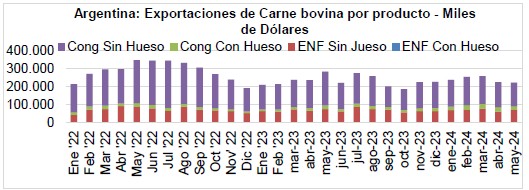Las exportaciones del mes de mayo de 2024 alcanzaron un volumen cercano a las 55,3 mil toneladas peso producto de carne bovina refrigerada y congelada; por un valor del orden de los 222,6 millones de dólares. Con respecto al mes de abril de 2024, los volúmenes embarcados muestran una moderada caída, del (-7,8 %); mientras que el valor obtenido muestra un retroceso del (-1,0%)
