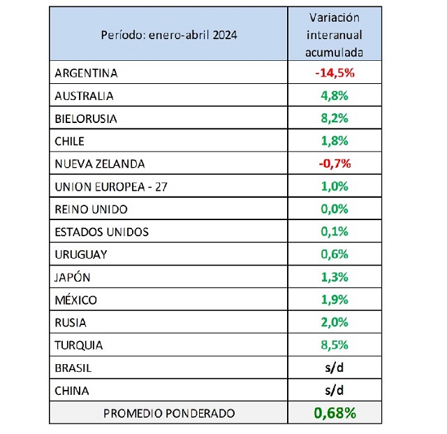 En el cuadro siguiente se toma este grupo de países de fuerte aporte en la lechería global, y su evolución en 2024: