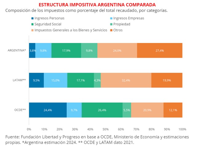 Eugenio Marí, Economista Jefe de la Fundación Libertad y Progreso, opinó que "la estructura impositiva argentina es el resultado de múltiples administraciones que fueron creando impuestos para atender a las subas del gasto público. Incluso, la mayoría de estos impuestos fueron transitorios, aunque se quedaron de manera permanente, como Bienes Personales, la suba de la alícuota del IVA, los derechos de exportación o el Impuesto PAIS. El acierto del gobierno es que está avanzando en una reducción del gasto, lo que le permitirá eliminar de manera creíble varios de estos impuestos que mencionamos". Además, Marí agregó que "la cuestión la tenemos que analizar desde el punto de vista del equilibrio general. Si se baja el gasto y se eliminan impuestos de manera creíble, esto creará una mejora en la rentabilidad del trabajo y las empresas, fomentando la creación de empleo y la inversión".