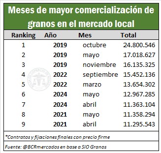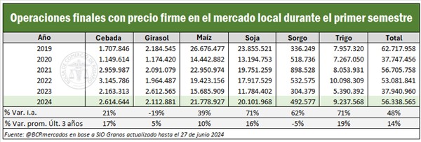 De acuerdo con los registros oficiales de SIO Granos, el volumen comercializado de soja, maíz, trigo, girasol, sorgo y cebada, tanto en contratos y fijaciones con precio firme, alcanzaron 56 Mt. Este valor representa un aumento del 48% respecto al mismo período el año anterior y un incremento del 14% al compararlo con el promedio de los últimos 3 años.