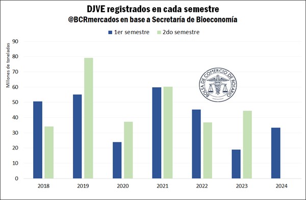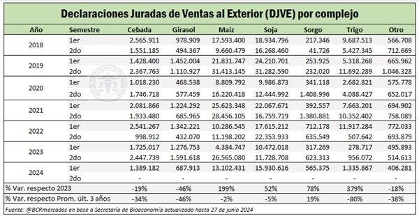 Las Declaraciones Juradas de Ventas al Exterior (DJVE) alcanzaron hasta el 27 de junio un total de 33,42 Mt, un 76% más de lo registrado en el primer semestre de 2023 pero un 23% por debajo del promedio de los últimos tres primeros semestres.