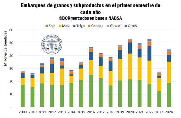 En el primer semestre del año se han despachado desde todos los puertos argentinos aproximadamente 44,9 Mt, esto significa un aumento del 63% respecto al mismo período el año anterior pero un 9% menos respecto a la mediana de los últimos 5 años.