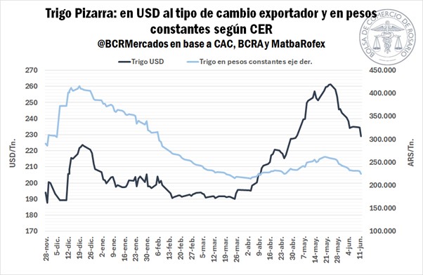 En línea con lo comentado anteriormente y sumado a la dinámica internacional, la pizarra por trigo también ajustó fuertemente a la baja. Al tipo de cambio exportador promedia USD 230/t cuando supo sobrepasar USD 260/t hace exactamente un mes, aunque, aun así, los niveles actuales superan a los negociados previo a mayo.
