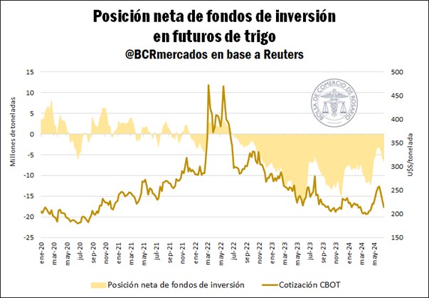 En primera instancia, a fines de abril y antes de las continuas revisiones de las agencias privadas sobre la cosecha triguera, los fondos especulativos en Chicago mantenían una cartera netamente vendida en más de 12 Mt equivalentes (96 mil contratos); esa posición vendida, al 28 de mayo se redujo hacia las 3 Mt (25 mil contratos) volcando hacia el mercado de futuros órdenes de compras netas por 9 Mt equivalentes (70 mil contratos) explicando en gran parte la sobredimensión en precios que el mercado convalidó durante mayo.