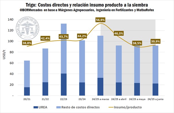 Durante mayo, la posición DIC’24 llegó a negociarse en USD 257/t, manteniendo los precios promedios a cosecha más elevados de la historia luego del 2022 y sosteniendo elevados niveles durante las primeras semanas de junio. Así la relación insumo-producto tendió a mejorar significativamente en relación con las estimaciones de principio de año en una combinación de precios al alza y fertilizantes estables. De hecho, durante mayo, con los precios vigentes en ese momento, la ratio entre los costes directos por tonelada y el precio fue inclusive más baja que durante la campaña 2020/21.