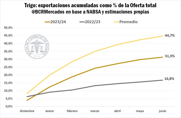 Al tiempo que Argentina se adentra en la segunda mitad del año, los productores de trigo ya están más enfocados en la siembra y evolución del cultivo 2024/25, aunque resta camino por recorrer del actual ciclo 2023/24. Este cultivo suele comercializarse rápidamente al comienzo de la campaña comercial entre diciembre y enero, por lo que de aquí hacia adelante el volumen de negocios por el trigo ya cosechado tiende a enfriarse, siendo la industria molinera la que más presión ejerce sobre el mercado para originar mercadería. Respecto al plano externo, las exportaciones van perdiendo también volumen y Argentina tiende a concentrar los envíos a Brasil dado que, al ingresar la nueva cosecha del hemisferio norte, se complejiza competir en los destinos más lejanos.