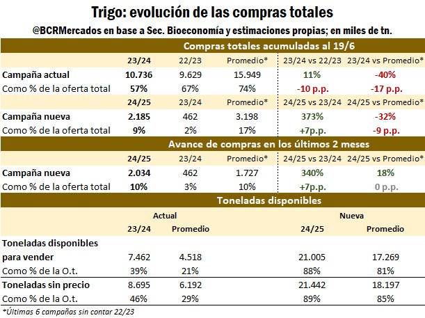 Sin embargo, al referirnos a la dinámica de la comercialización por trigo nuevo, el panorama se invierte favorablemente. Las extraordinarias cotizaciones que se negociaron durante todo mayo y la primera quincena de junio incentivaron las ventas anticipadas del cereal. La configuración de muy buenas condiciones iniciales sobre la humedad en los suelos, el fenómeno de La Niña que paulatinamente tiende a moderarse (ver GEA-BCR) y una relación insumo-producto favorable brindaron el condimento necesario para que durante los últimos sesenta días se comprometieran 2 Mt de trigo 2024/25, 20% por encima de la media en términos absolutos para este período y en línea con el promedio en términos relativos a la oferta total proyectada.