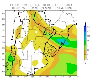 La perspectiva comenzará con el paso de un Frente de Pampero, con lluvias escasas en la mayor parte del área agrícola, salvo en una franja con lluvias moderadas a abundantes sobre su extremo norte. La Cordillera recibirá nevadas intensas en gran parte de su extensión, mientras el sur de la Región Pampeana y el extremo sur del Uruguay podrían recibir nevadas ligeras que probablemente no se concreten. Los vientos polares, que acompañarán el paso del frente, producirán temperaturas mínimas bajo lo normal en la mayor parte del área agrícola, con heladas generales y localizadas en las zonas serranas del oeste, gran parte de Cuyo,