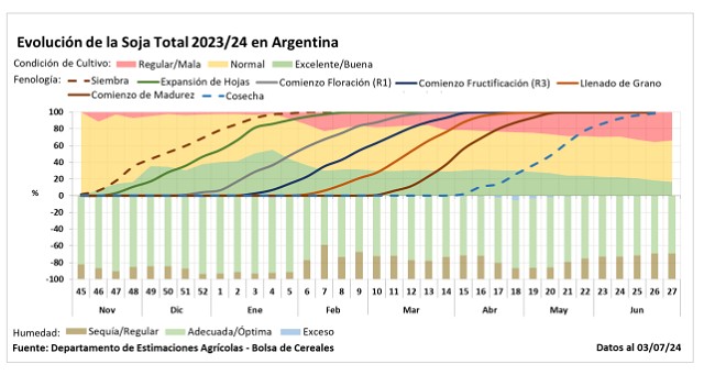 De las 6,3 MHa proyectadas, el 85,3 % se encuentran sembradas, luego de un progreso intersemanal de solo 4,3 puntos porcentuales. El 73,7 % del área presenta condición hídrica Adecuada/Óptima.