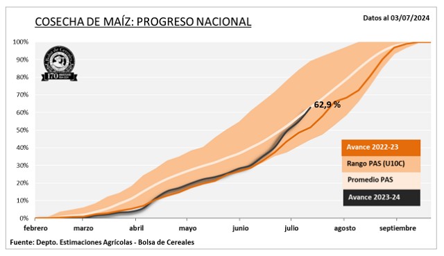 Luego de un avance intersemanal de 8 p.p. se ha cosechado el 62,9 % del total estimado, con un rinde medio de 67,5 qq/Ha. En este contexto, mantenemos nuestra proyección de producción en 46,5 MTn.