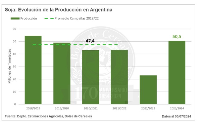 Por otro lado, se da por finalizada la cosecha de soja a nivel nacional con una producción acumulada de 50,5 MTn, aunque quedan lotes por recolectar en sectores del centro y sur de Buenos Aires que no modificarían la actual estimación de producción. El volumen obtenido representa un aumento del 6 % respecto al promedio del período 2018/22 (47,4 MTn) y el rendimiento medio se ubicó en 29,9 qq/Ha, siendo el segundo más alto de las últimas cinco campañas.
