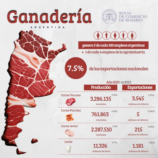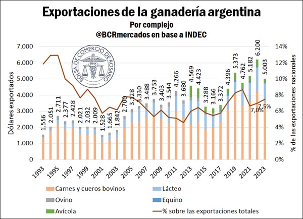 La ganadería argentina exportó cerca de US$ 5.000 millones en el año 2023, una caída próxima al 20% respecto a los niveles exportados en 2022. No obstante, el recorte exportador de la ganadería fue menor que el del nivel general exportador. De esta manera, la participación de la ganadería en las exportaciones nacionales pasó del 7% al 7,5% en 2023.
