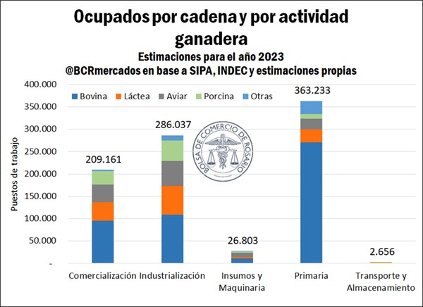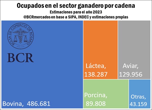 Con un volumen de empleo de las cadenas agroindustriales ubicado cerca de 3,6 millones de puestos de trabajo en 2023, la ganadería es consecuentemente responsable de 1 de cada 4 empleos generados por la agroindustria argentina. Asimismo, con una población ocupada de 19 millones de personas, la ganadería argentina genera cerca de 5 de cada 100 empleos a nivel nacional.