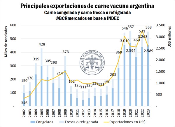 Más allá de esta baja exportadora, la demanda externa de la ganadería argentina se mantiene firme. Las exportaciones de carne bovina, responsables de más de la mitad del comercio exterior ganadero, mantuvieron su tendencia creciente en volumen exportado. En este sentido, los envíos al exterior de carne sin hueso crecieron más de un 4% el año pasado respecto a 2022. Sin embargo, dentro de este grupo, tanto la carne refrigerada como la congelada experimentaron fuertes caídas en sus valores exportados.