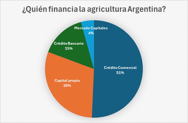 Cada 100 U$s que el campo necesita para la siembra y sus labores, 30 U$s los aporta el productor con fondos propios, 51 U$s los aporta la cadena comercial, 15 U$s los bancos y 4 U$s el mercado de capitales.
