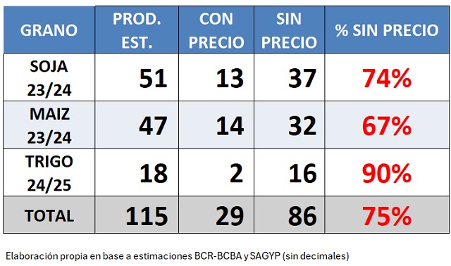 De acuerdo al siguiente cuadro, de la campaña 2023/24 se encuentran sin fijar precio el 74% de la producción de soja y el 67% del maíz. (37Mill. tn. y 32 Mill. tn. respectivamente). En tanto del trigo campaña 2024/25, se han comercializado con precio casi 2 Mill. tn, restandocerrar precio, por el 90% de la producción estimada.