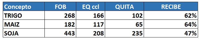 En el siguiente cuadro comparamos el valor FOB , y lo que recibiría en equivalente dólar contado con liquidación. La diferencia es la quita entre los mal llamados, derechos de exportación (33% soja y 12% trigo y maíz), diferencial cambiario y otros costos de logística.