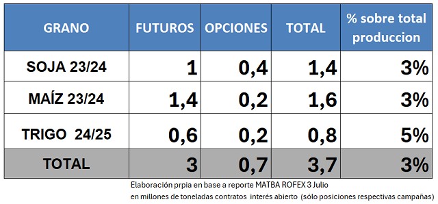 Si tomamos el interés abierto de los contratos de futuros y opciones (put y call) que cubren a dichos cultivos, resulta el siguiente volumen en millones de toneladas: