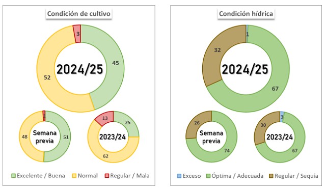 El progreso intersemanal de las labores fue de 7,6 p.p. y cubre a la fecha el 92,9 % de las 6,3 MHa proyectadas, reflejando un adelanto interanual de 6,9 p.p. El 97,2 % del área en pie presenta condición Normal-Excelente.