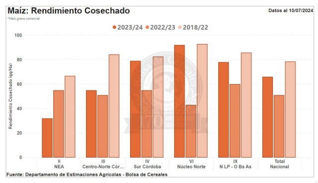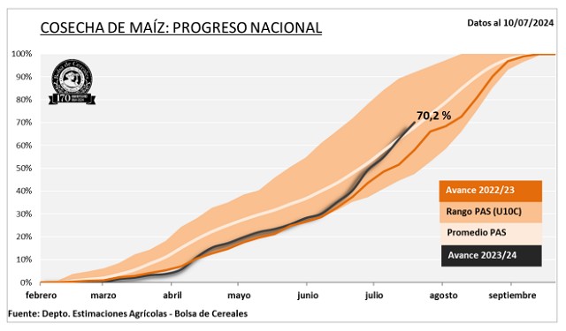 Con un adelanto interanual de 12,1 puntos porcentuales, se ha cosechado el 70,2 % del total estimado con un rinde medio de 66,1 qq/Ha. Mantenemos nuestra proyección de producción en 46,5 MTn