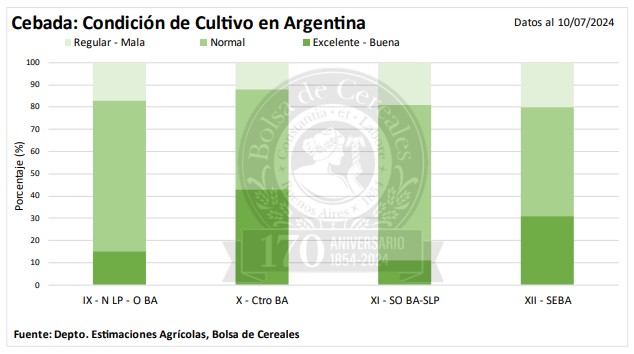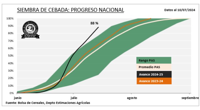 Asimismo, luego de un avance interquincenal de 39 p.p. la siembra de cebada cubre el 88% de la superficie proyectada a nivel nacional. Se registra un adelanto de 23 p.p. respecto a la campaña previa, motivado por la humedad al inicio de la ventana de siembra. Las labores han finalizado sobre la región central a excepción del Norte de La Pampa-Oeste de Buenos Aires, donde son necesarias nuevas precipitaciones para finalizar con los planes de siembra. Los planteos tempranos han iniciado el periodo de macollaje bajo buenas condiciones de humedad. Por otro lado, sobre los núcleos cebaderos del sur las labores se encuentran próximas a finalizar, restando sembrar el 22 % del área proyectada. Al igual que en trigo, los últimos lotes sembrados registran demoras en su emergencia debido a las bajas temperaturas.