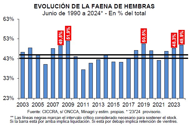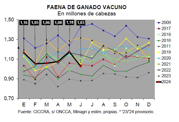 Claramente, fue el factor climático el que explicó el paso de un pico a un valle de la faena de hacienda vacuna en apenas doce meses. En tanto, la participación de las hembras en la faena total continuó subiendo durante junio, llegando a 49,9%, el tercer registró más elevado para el mes de junio en treinta y cinco años.