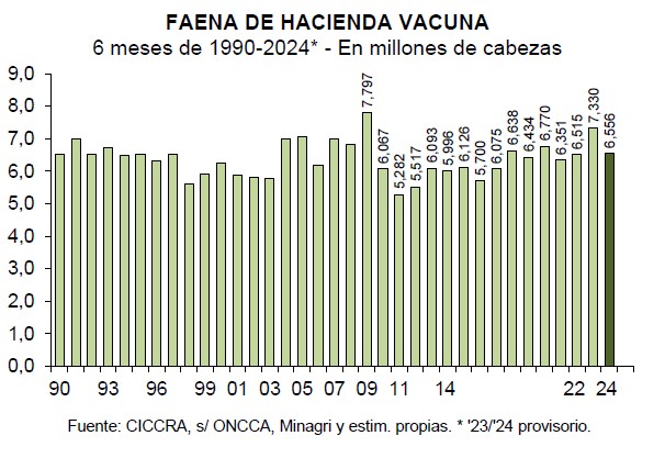 Con estos guarismos, en los primeros seis meses de año un total de 359 establecimientos faenaron 6,556 millones de cabezas de hacienda vacuna. La comparación con el primer semestre de 2023 arrojó una caída de 10,6%