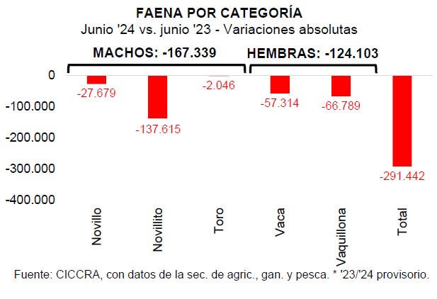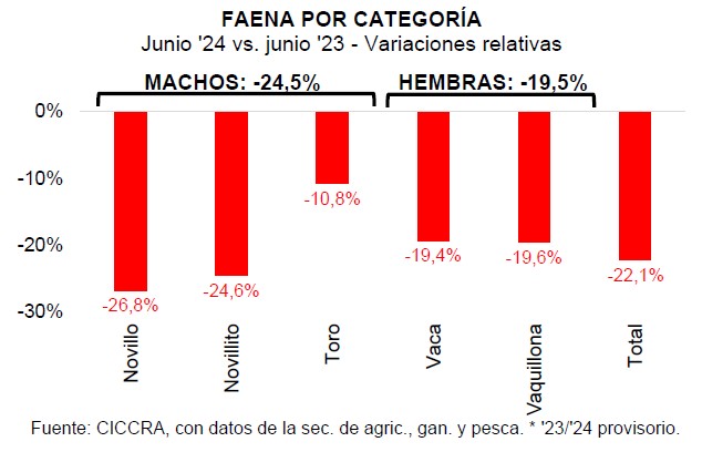 La faena de machos descendió 24,5% entre junio de 2023 y junio de 2024, totalizando 515,1 mil cabezas. La caída fue similar para novillitos y novillos, 24,6% y 26,8% anual, respectivamente.