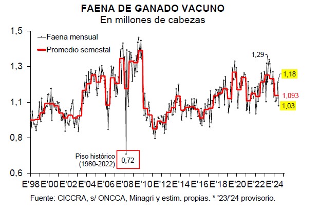 Al colocar estos datos en la perspectiva ‘histórica’ con el objetivo de comprender mejor los efectos de la extensa y profunda seca que afectó a la producción ganadera en los últimos años, surge que la venta anticipada de hacienda y la liquidación de vientres ubicó la producción de carne vacuna del primer semestre de 2023 en el lugar más alto de los últimos treinta y cinco años. A la inversa, la corrección del stock de madres y el impacto negativo de la falta de agua y alimento suficiente, hizo que la disponibilidad de hacienda para faenar en esta campaña fuera muy inferior.