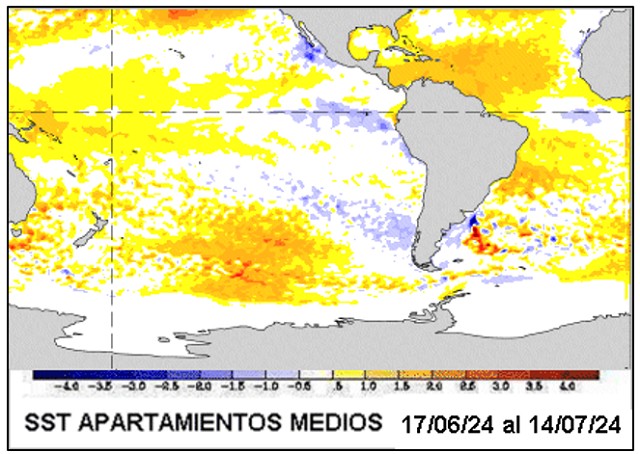 El despliegue del agua fría superficial es lento, moderado y por lo pronto sin influencia en la circulación atmosférica. Se espera que el indicador ENSO, se estabilice en valores de La Niña entre noviembre y febrero. Es decir un período relativamente corto y también, por ahora, con un desvío negativo -enfriamiento- relativamente débil. En consecuencia, seguiremos con atención la evolución de este forzante de escala planetaria tan sensible para el sudeste de Sudamérica pero, objetivamente, la problemática de las actuales condiciones climáticas nos lleva a poner más atención a lo que suceda con la escala regional sobre todo a partir de la segunda parte del mes de agosto.