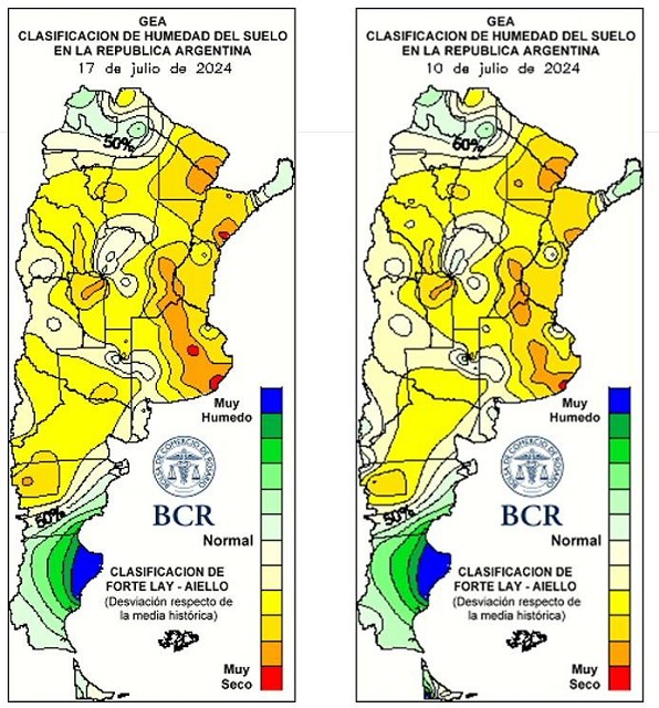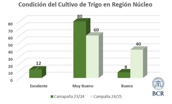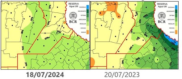 A pesar de la intensa circulación de aire frío que dominó durante la primera parte del mes, el estado general del trigo en la región núcleo es muy bueno en el 60% de los cuadros y bueno en el 40%. El año pasado sin estos fríos y con lluvias a finales del otoño, los lotes estaban en mejores condiciones: “están para la foto”, decian los técnicos. Pero la falta de agua en profundidad acechaba en el 2023 al sector oeste de la región.