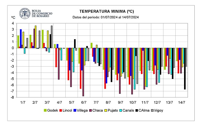 Para Rosario, la temperatura media de julio según la estadística es de 10,1°C, pero en la 1ra mitad de julio 2024 la media fue de 4,8°C (50% por debajo de lo normal). En el caso de las mínimas, la media estadística marca un valor de 4,9 °C, pero en Rosario se registró -6,8°C en esta quincena glacial. En Marcos Juárez los técnicos han medido -11ºC a 5 cm del suelo en los últimos días.