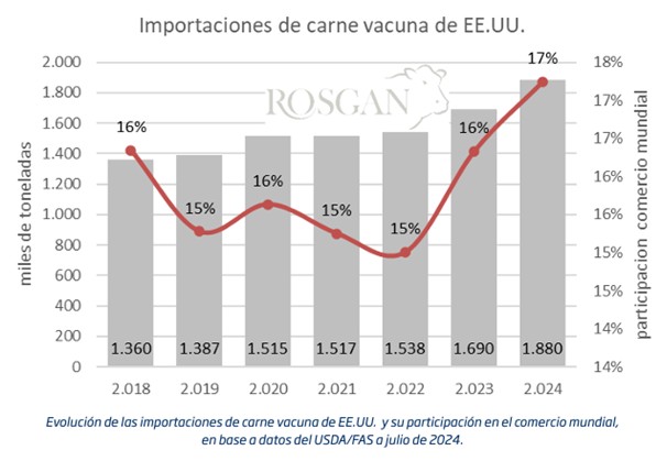 Recordemos que tres meses atrás el USDA reflejaba un escenario muy diferente, con desaceleración en la demanda de carne vacuna que lo llevaba a retrotraer los volúmenes importados por debajo de lo registrado en 2022 y 2023. Este escenario se basaba en parte a la abundante oferta de carne que acumulaba internamente, pero también en la necesidad de los consumidores locales de buscar proteínas más baratas.