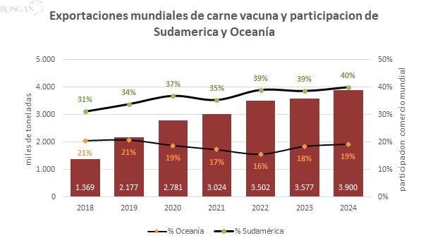 En suma, analizado por región, vemos que mientras para Oceanía (Australia y Nueva Zelanda) este crecimiento le permite recuperar lentamente su participación en el mercado mundial, para los países de la región (Brasil, Argentina, Uruguay y Paraguay) significa aumentar su presencia en el mercado mundial, posicionándose como la principal región proveedora de carne vacuna, llegando a abastecer el 40% de las exportaciones globales.