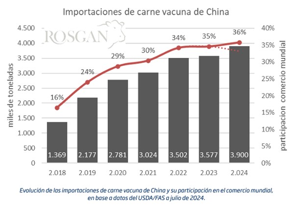 Otro de los grandes cambios que plantea este año y que en este último informe se sigue confirmando es el crecimiento en la demanda externa de carne vacuna por parte de Estados Unidos. En este caso, el aumento viene dado por una sólida demanda interna en medio de un proceso de contracción de su rebaño ganadero que lo lleva a reducir su producción local hasta el nivel más bajo desde 2018, aumentando en consecuencia su demanda externa a casi 1,9 millones de toneladas, más de un 20% en los últimos 2 a 3 años.