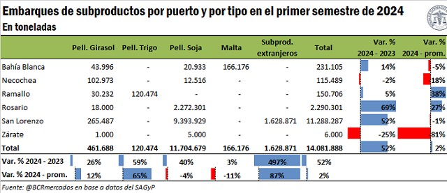 Respecto a los subproductos, se advierte un incremento interanual de 4,8 Mt en el volumen embarcado durante los primeros seis meses del año. En términos absolutos, casi la totalidad de ese incremento se explica por el mayor volumen despachado de pellets de soja, que ascendieron 3,3 Mt, es decir, un incremento del 40% con respecto a igual período del año anterior. Con relación a los envíos de pellets de girasol y de trigo, se observa un crecimiento interanual del 26% y 59%, respectivamente, equivalente a 94.000 y 44.500 toneladas. Por último, la malta mostró un ascenso de apenas 3% en comparación con el año previo, lo que en términos absolutos representa apenas 4.400 toneladas.